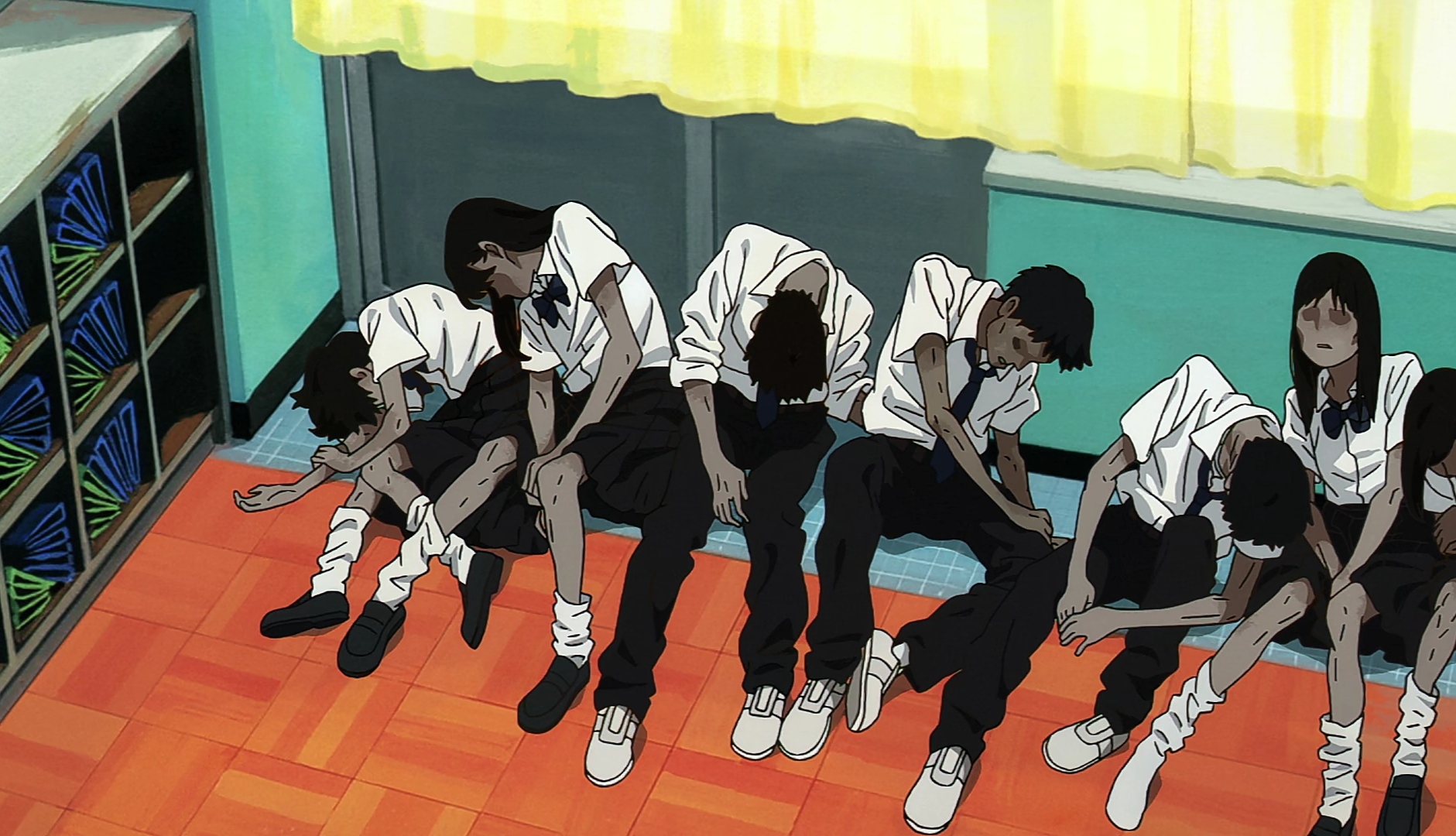PLOT : The plot is inherently weird and off-putting at first, but everything is set up in just the right way to make you uncomfortable yet induce a sense of familiarity. The characters get Isekaid to another dimension. The show establishes quite early on that the characters aren’t going to enjoy their time in this universe, unlike the typical Isekai ones. Self-governing kids heading towards their doom is a concept that I’m surprised not many other anime have done before, that’s enough to make me interested in kids (not a pedo).
