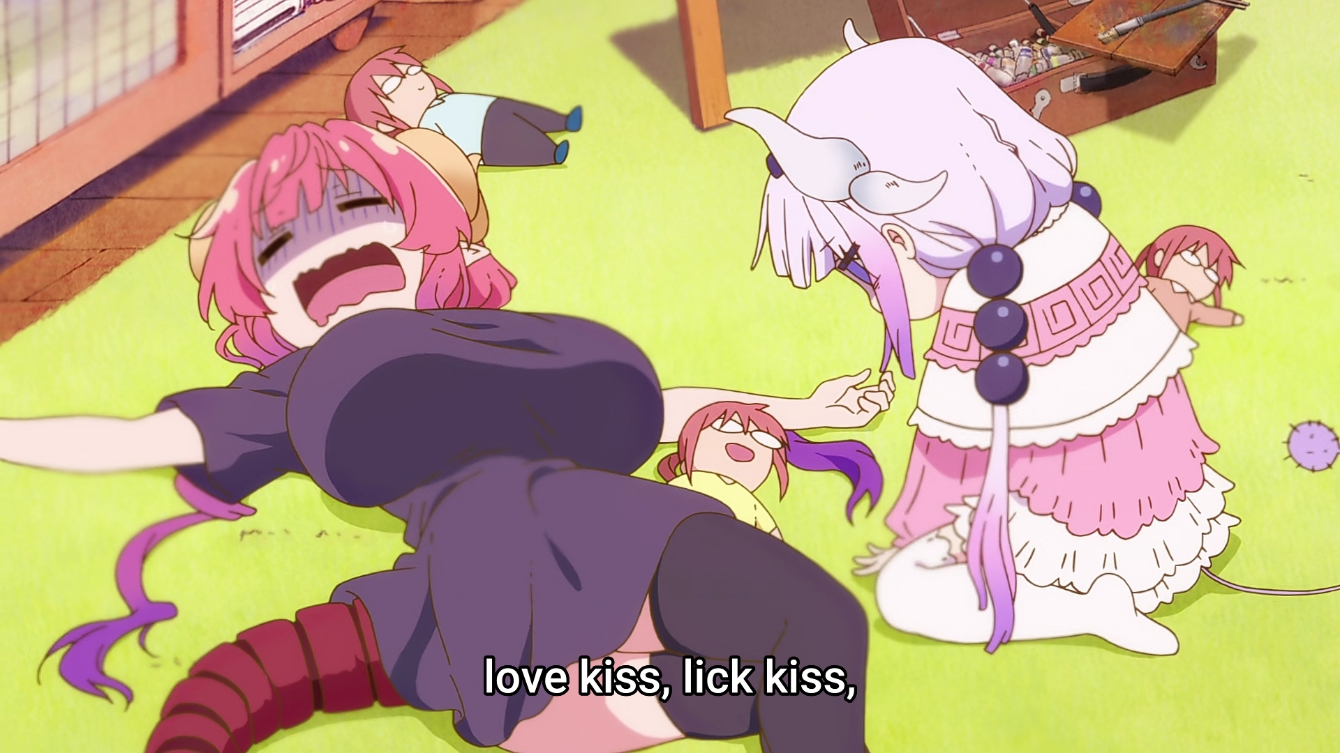 THE CHARACTERS : After being mostly neglected in the previous episodes, the beloved side characters finally get their moments to shine in this one. It started with a deep dive into Ilulu’s childlike mentality and how she wasn’t really allowed to delve into that part of her character. Then we had the young ‘uns playing a game of monopoly, Tohru making a maid costume for Kobayashi, Tohru trying to find a hobby, and Rika and Kanna’s shenanigans. Rika, Lucoa, and Ilulu all had great showings this episode, with Lucoa being better than in most other appearances.