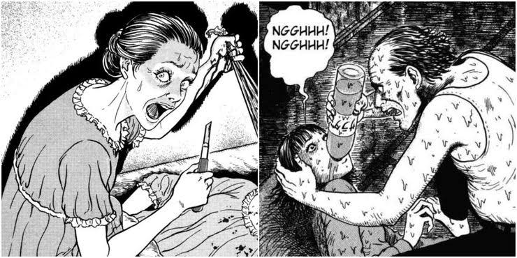 THE ART : This story really is scary and what helps it is its sick and creepy style art. These characters are really well drawn and have a small alteration that makes them different from one another. The world itself is well drawn and if you look close enough, you’ll find spirals that aren’t even apart of the story at hand. There’s also a LOT of disturbing scenes in the story, which is freaky.