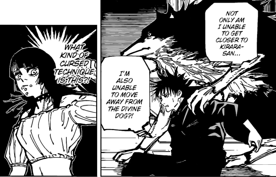 Megumi tries to attack Kirara with his dog but realises that something was making him unable to separate with his Divine Dog (like a magnetic attraction).