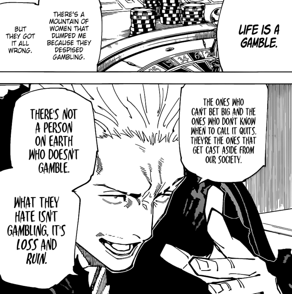 Hakari explained to Yuji about the stupid people who are all driven by “fever” in their lives. He emphasized that gambling is life and everyone gambles.